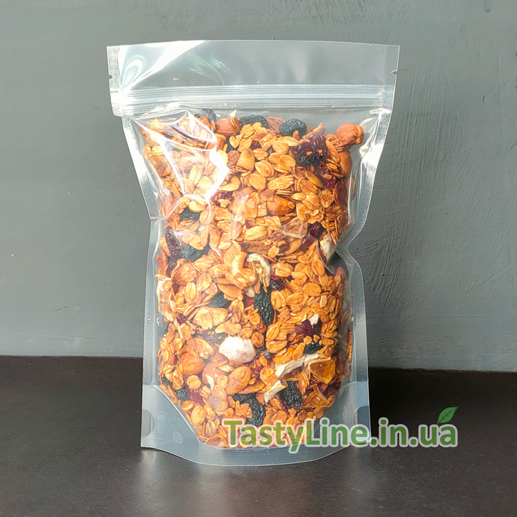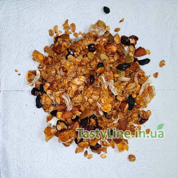 Состав: овсяные хлопья длительного приготовления, кешью, миндаль, тыквенные семечки, вяленая клюква, натуральный изюм синий теневой сушки, сушеный мандарин, натуральный мед, оливковое масло.